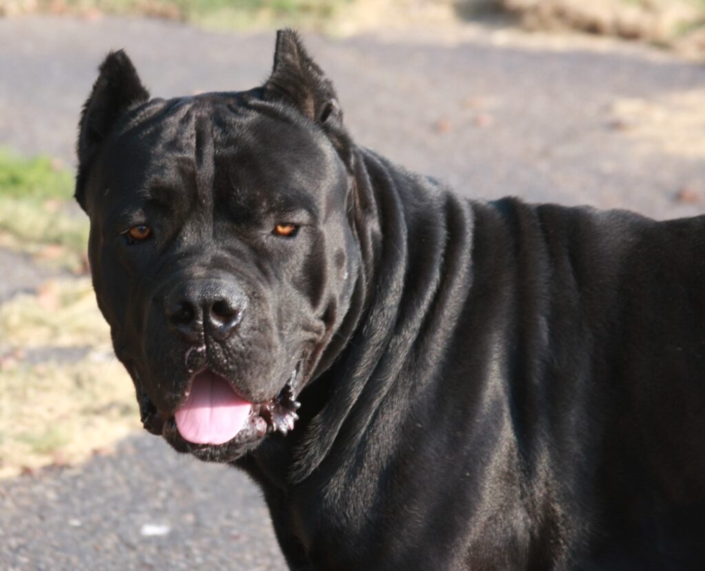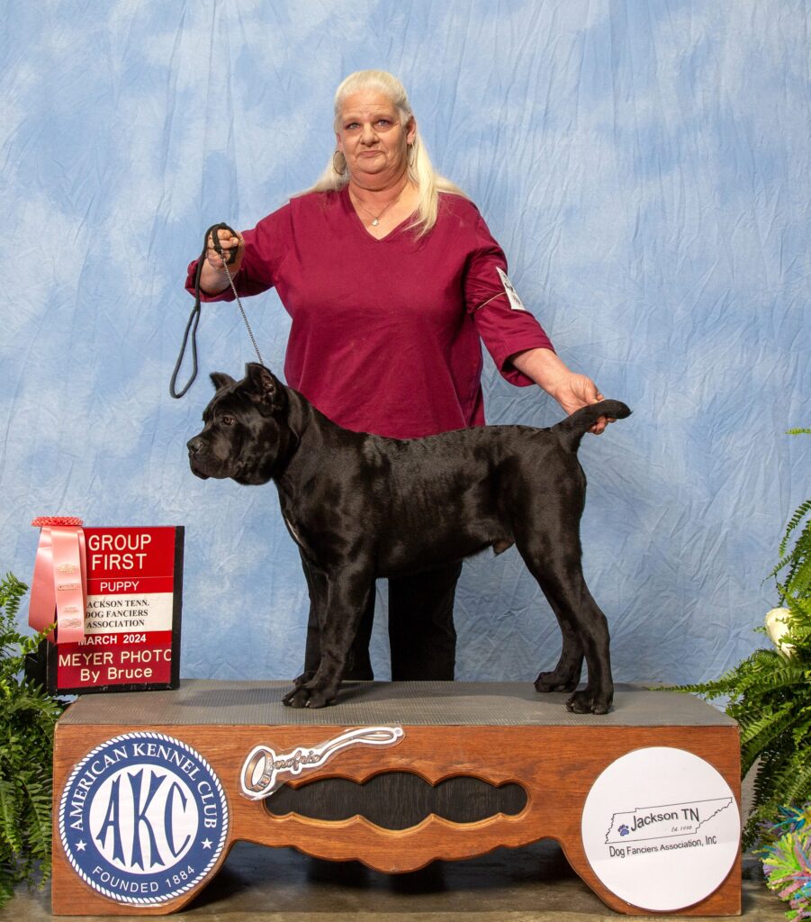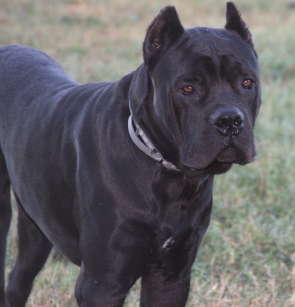 River is the 5th generation of Storm Front breedings. Solid black with just a few white hairs on chest. Big bone and head with a great temperament. Last weighed in at 120 lbs. He is 27 inches at the shoulder.